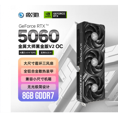 影驰 GeForce RTX 5060 金属大师 V2 黑金 OC DLSS 4 电竞游戏设计剪辑直播娱乐AI本地部署电脑显卡